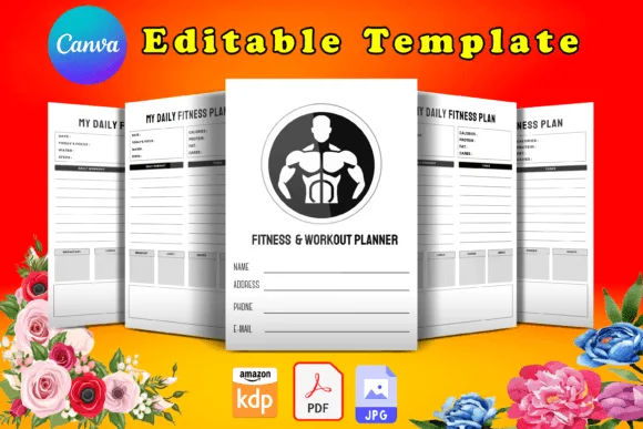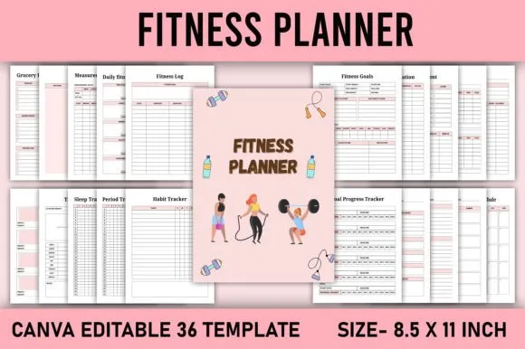 Fitness Planner Canva Template KDP 36 pages, US Letter, 300 DPI, CMYK, no bleed β tested for KDP. Inside: supplement and macro trackers, strength training tracker, steps tracker, weight trackers (12 and 52 weeks), workout planner and log, running tracker, weekly meal plan, grocery list, diet plan, fitness goals and reflection, goal progress tracker, sleep and period trackers, habit tracker. Editable via Canva link, JPG, PNG, PDF files included.