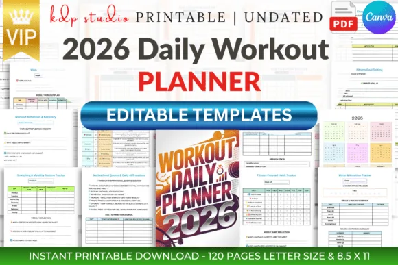2026 Workout Planner (KDP Interior) 42 unique pages, US Letter 8.5 Γ 11, 300 DPI, no bleed. Inside: a 2026 calendar and monthly planner, fitness goals, daily/weekly/monthly fitness, fitness reflection, weight loss tracker, body measurements, progress photos, strength training, workout log, steps tracker, running log, habits tracker, mood and sleep trackers, 30 Days and 100 Miles Challenges, 12 Week and 52 Week Weight Trackers, and a fitness journal. Fully editable in Canva, PDF/JPG/PNG included.