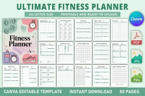 Editable Fitness Planner Bundle Canva 28 pages, US Letter 8.5 Γ 11, 300 DPI, CMYK, no bleed. The bundle includes: 7 Day Challenge, fitness goal (2 unique pages), workout planner (2 pages), 30 Day Challenge (2 pages), diet journal, daily fitness, weekly meal planner, food tracker, habit tracker, workout log, workout calculator, vitamin and supplement tracker, exercise log, fitness log, monthly planner, sleep tracker, food diary, and a 52 Week Weight Logbook. Editable in Canva, PDF/JPG/PNG included.