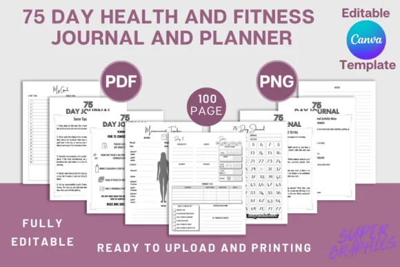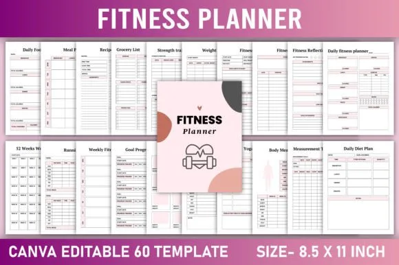 Health & Fitness Planner Canva KDP 60 pages, US Letter 8.5 Γ 11, 300 PPI, CMYK, no bleed, KDP tested. Contains: daily fitness planner, food journal, weekly menu, fitness goal, 30 Day Challenge, weight loss tracker, cardio tracker, 12 Week Challenge, habit tracker, running log, self-care planner, morning routine, sleep and water trackers, symptoms tracker, 30 Days Self Care Challenge, 90 Day and 21 Day Challenges, vision board, bucket list, and a Therapy List. Editable in Canva, PDF/PNG/JPG included.