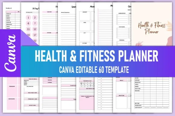 Health & Fitness Planner Canva Templates 63 editable Canva templates in a bright Β«Ice Cream ShopΒ» theme, A4 and US Letter sizes. Inside: daily, weekly, and monthly planners, weight and weight-loss trackers, running and cardio logs, a marathon schedule, protein shake recipes, shopping lists for keto, paleo, and vegan diets, medical records, an insurance expense journal, and a bonus β 10 free sheets when you sign up via email