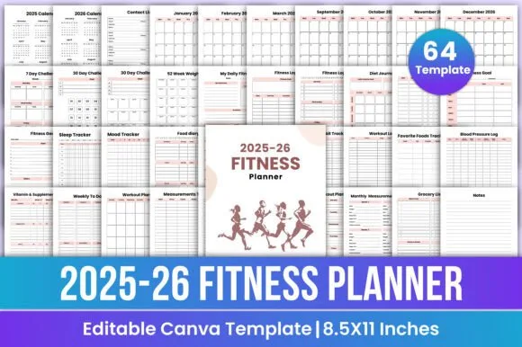 2025-26 Fitness Planner Canva Template 64 templates, US Letter, 300 DPI, CMYK, no bleed. Inside: a 2025β2026 calendar with holidays, a contact list, dated monthly planners, 7 Day and 30 Day Challenges, a 52 Week Weight Log, daily fitness, diet journal, exercise log, sleep and mood trackers, weekly meal planner, food tracker, habit tracker, workout log and planner, blood pressure log, vitamin and supplement tracker, and measurement trackers. Editable in Canva, all files included.