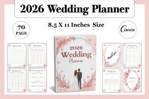 Planning a 2026 wedding? This is the perfect keepsake planner for you. This gorgeous 120-page printable journal is designed in a no-bleed format that looks clean and professional whether printed at home or through a print shop. It features a full 2026 year-at-a-glance calendar, detailed budget and expense tracker, bridal party organizer, guest list with RSVP tracker, catering and menu planner, florals and décor planner, photography checklist, music planner, vendor contact pages, vow writing space, wedding cake planner, and a complete honeymoon organizer. With 15 additional Canva editable pages, you can customize the layout to suit your personal style.