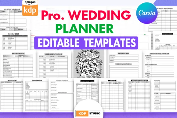 This practical and polished 47-page wedding planner is designed with real-world planning needs in mind. It covers everything from the basics (guest lists, timelines, venue comparisons) to the personal touches (a skin care routine tracker, a 30-day self-care challenge, and a glow-up challenge — because brides deserve to feel their best!). It’s also KDP-tested and ready to upload to Amazon for sellers. Files come in PDF, PNG, and JPG formats in CMYK color for professional printing. Fully editable via Canva, this planner is a great option for both personal use and passive income.