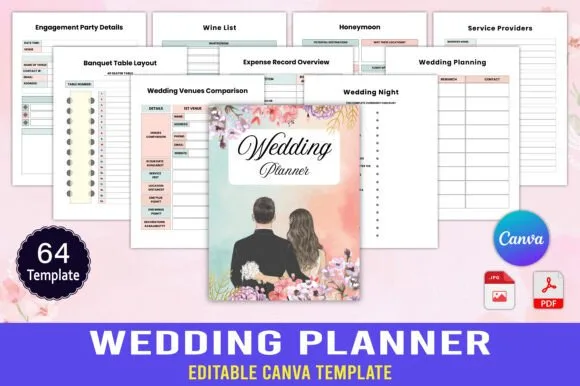 Detailed, thorough, and incredibly well-thought-out, this 64-template Canva wedding planner is a standout for couples who want granular control over every planning detail. It includes venue comparison sheets, dress selection trackers, master wedding checklist, countdown to-do lists, bridesmaid outfit trackers, floral checklists, theme and color scheme planner, multi-format guest and RSVP trackers, table layout planners, budget vs. actual spending tracker, vendor payment tracker, supplier quotes and comparison sheets, photography shot list, engagement shoot planner, engagement party and rehearsal dinner organizers, bridal shower and gift tracker, menu and wine list planner, wedding cake planner, transportation details, wedding day timeline, honeymoon destination comparison, and more.
