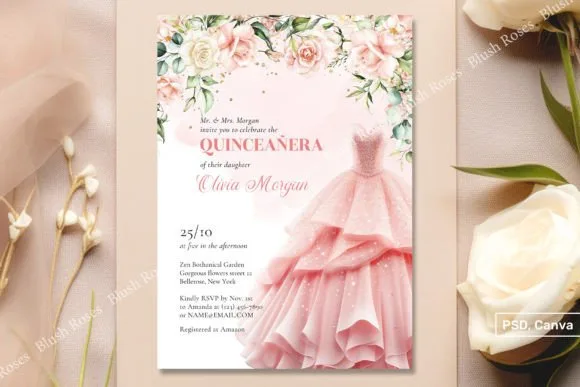 Drama. Elegance. Romance. This Blush Pink Roses Formal Long Dress Invitation template has all three in abundance. Originally conceived as a Quinceañera invitation, its sweeping formal long dress backdrop and delicate blush rose design translate seamlessly to black-tie weddings, bridal showers, and any event calling for a truly memorable first impression. The fully editable 5″×7″ PSD file works in both Adobe Photoshop 5+ and Canva, offering you two flexible editing paths. Every design element is high-resolution and print-sharp. The sophisticated font trio of Madelican, Rozha One, and Adobe Devanagari creates a layered, editorial typographic composition that feels undeniably couture.