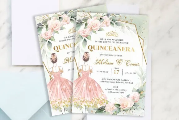 Crown on. Invitation in hand. This Princess Pink Dress Quinceañera Invite is an absolute fairy-tale of a template, blending a regal pink gown, a gleaming gold tiara, softly painted blush florals, sweeping eucalyptus, and an ornate gold frame into one breathtaking composition. The 5″×7″ fully editable PSD is a joy to work with — just open in Adobe Photoshop 5+, update the text, and your storybook invitation is ready to print. The font selection of Glamour Line, Le More Collection, and Adobe Devanagari brings layered visual richness that makes every design decision feel intentional and luxurious. Truly fit for a princess — or a queen.