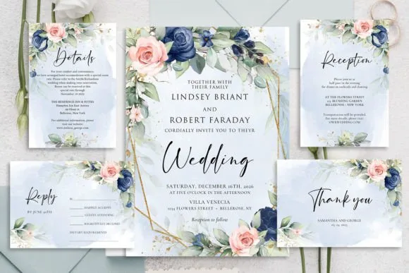 Navy and blush is a color pairing that never goes out of style — it’s equal parts bold and tender, classic and contemporary. This Navy and Blush Wedding Invitation Suite harnesses that beautiful tension into a complete four-piece stationery set: Invitation (5″×7″), Details Card, RSVP Card, and Thank You Card (all 3.5″×5″). All files are fully editable PSD format, designed at high resolution to guarantee crisp, blur-free printing every time. The fonts — British Castilla and Adobe Devanagari — lend the suite a formal, polished elegance that suits both intimate ceremonies and grand celebrations. Unlimited edits and downloads are yours, so feel free to perfect it before you print.