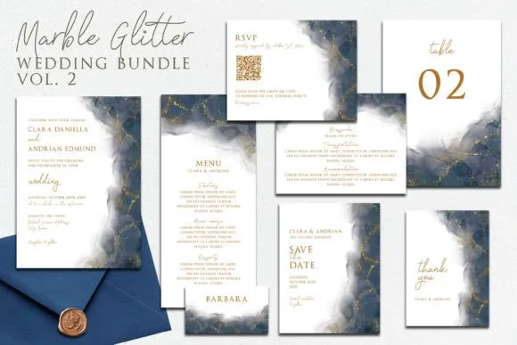 Few things say “luxurious celebration” quite like the combination of marble and glitter. This Marble Glitter Wedding Invitation Bundle brings that opulent aesthetic to an impressive 8-piece stationery collection covering every wedding paper need: Invitation (5.25″×7.25″), Save the Date, Details, RSVP, Thank You, Table Numbers, Place Cards (3.5″×2″), and a Menu (4″×9″). All files come as print-ready PSDs with Smart Object Layers, CMYK/300 DPI resolution, and a 0.25 inch bleed — essentially everything a professional print shop needs. Adobe Photoshop CS3 or higher is required, and links to all free fonts used are bundled right inside the download. This is boutique-quality stationery at zero cost.